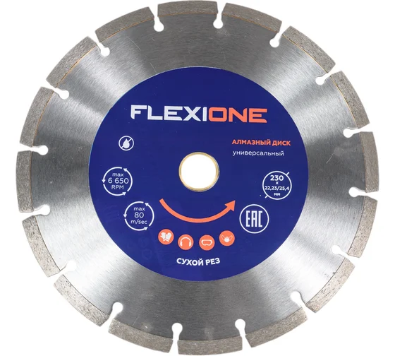Алмазный диск Flexione 50000455 с сегментированной кромкой 230х22,23 мм — универсальный инструмент для высокоэффективной резки различных строительных материалов.
