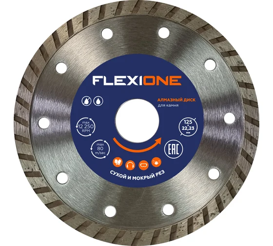 Алмазный диск Flexione 50000405 с турбированной кромкой диаметром 125 мм и посадочным диаметром 22,2 мм предназначен для резки строительных материалов, таких как камень, кирпич и бетон.