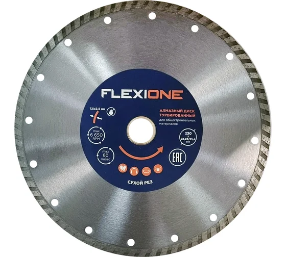 Алмазный диск Flexione 50000225 с турбированной кромкой — это высокоэффективный отрезной инструмент, предназначенный для работы с камнем и другими минеральными строительными материалами.