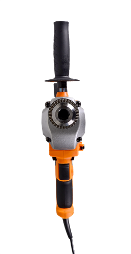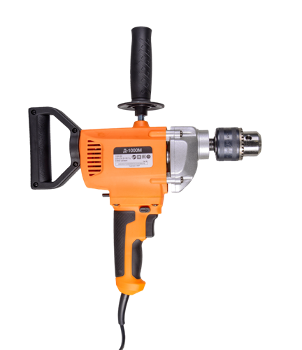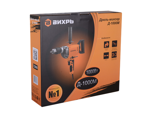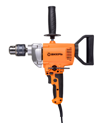 Дрель-миксер Д-1000М Вихрь — электрический инструмент двойного назначения, предназначенный для сверления отверстий в различных конструкционных материалах (дерево, сталь, кирпич, легкий бетон и т. д) (при установке соответствующих сверл), и перемешивание лакокрасочных материалов (при установке соответствующей насадки). Данное устройство сможет одновременно заменить два электроинструмента, что положительно скажется на бюджете покупателя.Особенности Д-1000М: 1. Дополнительная рукоятка для удобной работы в двух режимах (дрель и миксер). 2. Регулировка скорости вращения шпинделя нажатием на кнопку включения. 3. Функция реверса. 4. Наличие фиксатора кнопки включения позволяет зафиксировать ее в рабочем положении при длительной работе. 5. Возможность вращения задней рукоятки на 360° позволяет выбрать удобный хват. Преимущества Д-1000М: 1. Многоцелевая дрель-миксер идеально подходит для сверления отверстий большого диаметра и размешивания различных растворов, краски и бетона 2. Высокий крутящий момент позволяет сверлить глубокие отверстия большого диаметра, например, сверлом Левиса и размешивать различные ЛКМ и даже бетон 3. Электронная регулировка частоты вращения позволяет начать размешивание без разбрызгивания и производить точное сверление отверстий 4. Реверсирование вращения помогает как извлекать сверла из глубоких отверстий, так и менять направление перемешивания простым переключением рычажка 5. Металлический корпус редуктора обеспечивает повышенную прочность узла и лучшее охлаждение редуктора в условиях повышенных нагрузок 6. Усиленная основная рукоятка с удобным держателем ключа патрона 7. Ключевой патрон с максимальным диаметром 16 мм под большинство сверл и хвостовиков насадок 8. Фиксатор выключателя в нажатом положении для длительных работ 9. Возможность быстрой замены щеток, что позволяет практически не прерывать рабочий процесс 10. Прорезиненный кабель, выдерживающий пониженные температуры, «не дубеющий» на морозе.
