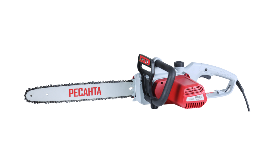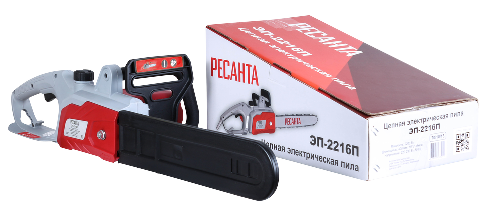 Электропила Ресанта ЭП-2216П предназначена для бытового использования: распиловка бревен, валка садовых деревьев, обрезка сучьев. Благодаря обрезиненной рукоятке держать такой агрегат в руках удобно и комфортно. Привод цепи осуществляется за счет электродвигателя, который работает от сети переменного тока 220В. Преимущества: — Надежное удержание. Удобная задняя рукоятка небольшого размера с пусковым курком жестко сидит в руке, что способствует надежному удержанию электропилы. — Безопасность. Автоматический тормоз цепи в виде щитка обеспечивает безопасность работы с электропилой, в первую очередь, защиту ваших рук. — Комфортное использование. В основании рукоятки предусмотрен специальный фиксатор для предотвращения отсоединения штекера от розетки. — Удобство обслуживания. Заменить щетки электродвигателя можно быстро и просто за счет их удобного расположения. Достаточно открутить крышку щеткодержателя. Отличительными особенностями электропилы Ресанта являются простота и удобство в работе, ведь она не требует заправки топливом и работает от сети 220В. Также стоит отметить низкий уровень шума, создаваемый при работе, а также полное отсутствие выхлопных газов. Это означает, что вы можете использовать пилу не только на улице, но и в помещении при ремонтных и строительных работах. Вы можете легко регулировать натяжение цепи с помощью винта, расположенного на корпусе справа. Прямая передача мощности — проста и надежна. К характеристикам, обеспечивающим комфортное пользование инструментом, также можно отнести автоматическую смазку цепи. Чтобы вы смогли определить уровень смазки для цепи, в корпусе есть смотровое окошко с делениями. Единственная особенность — это недостаточная мобильность, ведь пользоваться инструментом можно только в непосредственной близости от розетки переменного тока 220В. Этот легко исправить, используя переноску (с кабелем подходящего сечения!) или бензогенератор Ресанта. Для электропилы ЭП-2216 подойдут цепи со следующими параметрами: количество звеньев 57, шаг цепи 3/8, толщина ведущего звена 1.3, шина 161.