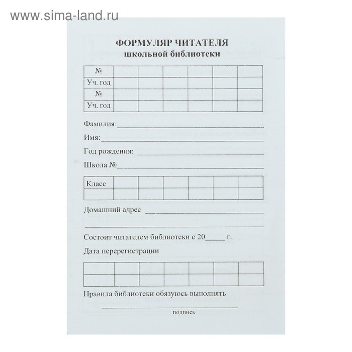 Формуляр читателя школьной библиотеки А6, 8 листов, офсет 80 г/м²