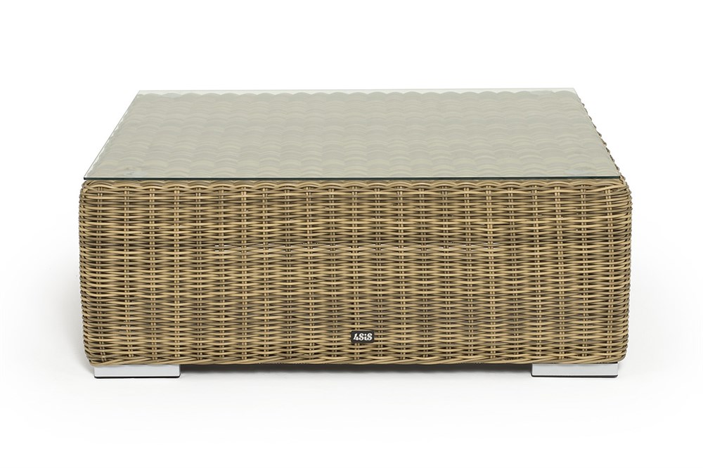 Размер модели – 950×950×350 мм. Ее каркас сделан из высокопрочного алюминия, который оплетен искусственным ротангом с помощью ручного круглого плетения. Столик представлен в соломенном цвете.