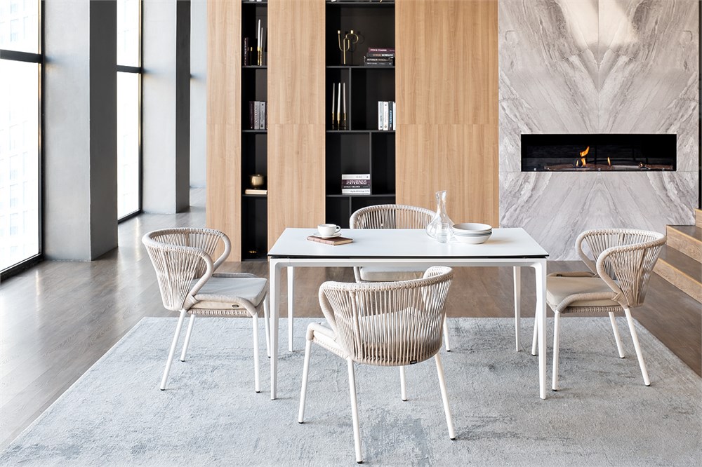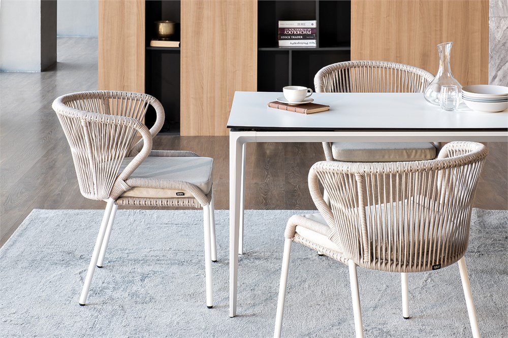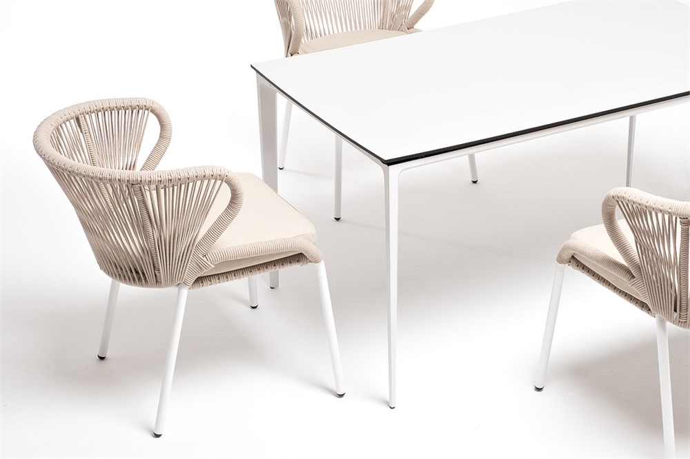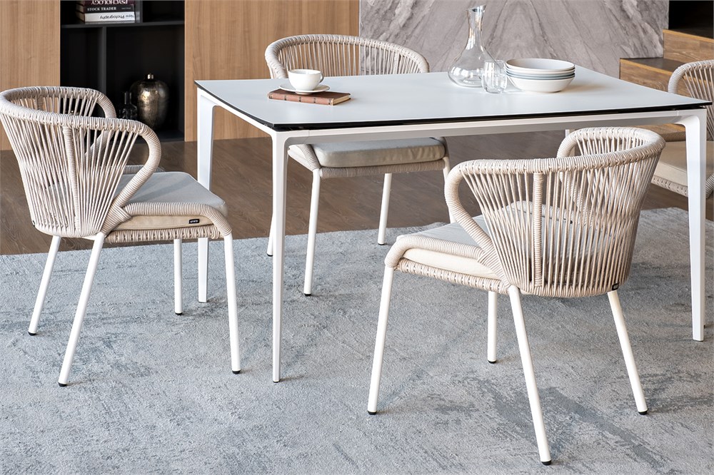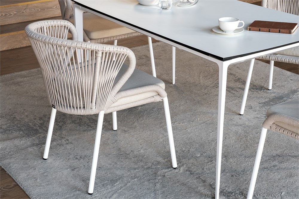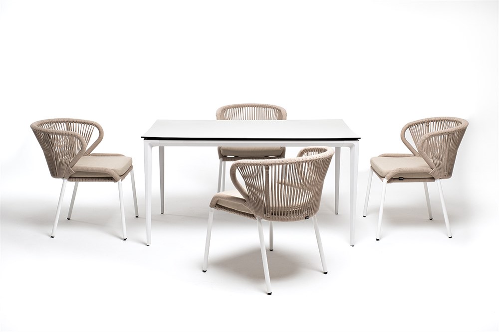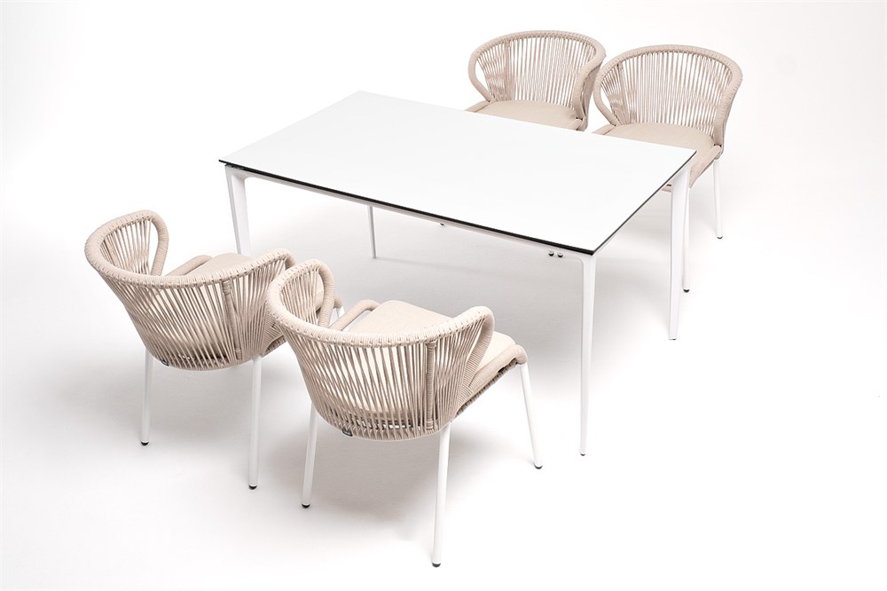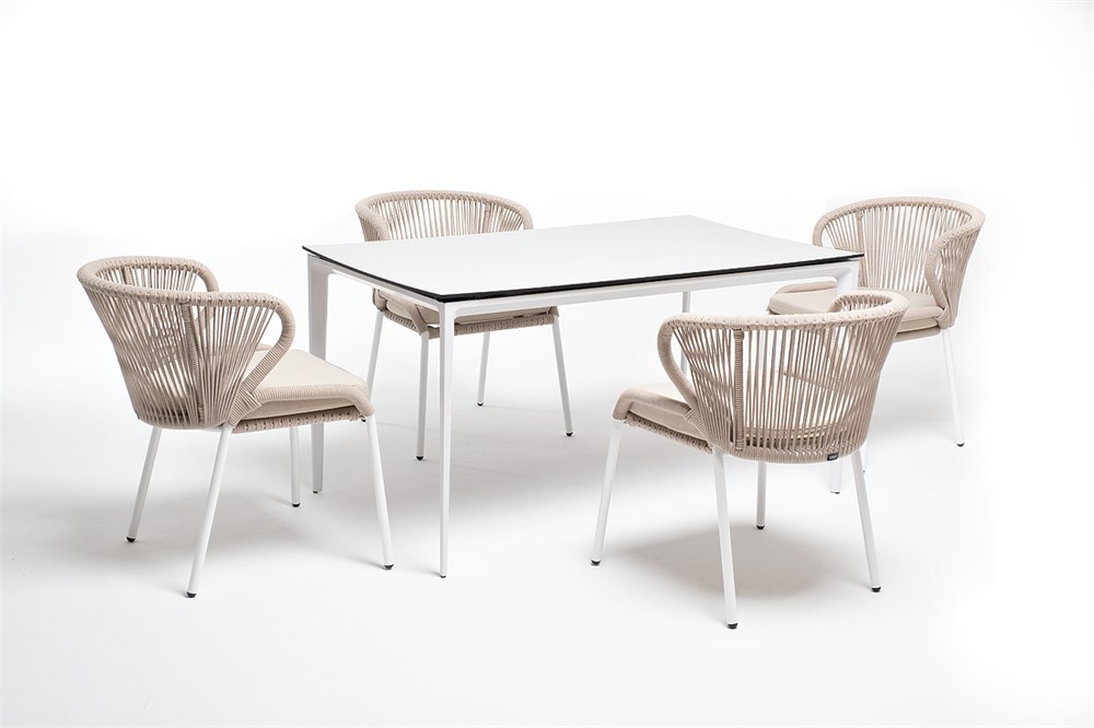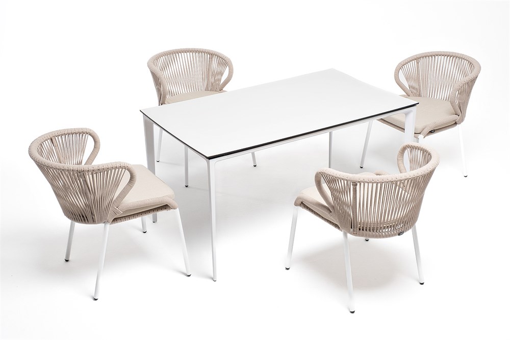 Обеденная группа «Малага» предназначена для комфортного размещения 4-х человек. В этот комплект входит стол с прочной и стильной столешницей из HPL-пластика размером 1400×800 мм и высотой 75 см (цвет столешницы — молочный), а также 4 плетеных стула «Милан», изготовленных из бежевого роупа с белым алюминиевым каркасом. Размеры каждого стула составляют 600×660×795 мм. Эта обеденная группа будет стильным и функциональным дополнением для вашей кухни или столовой.