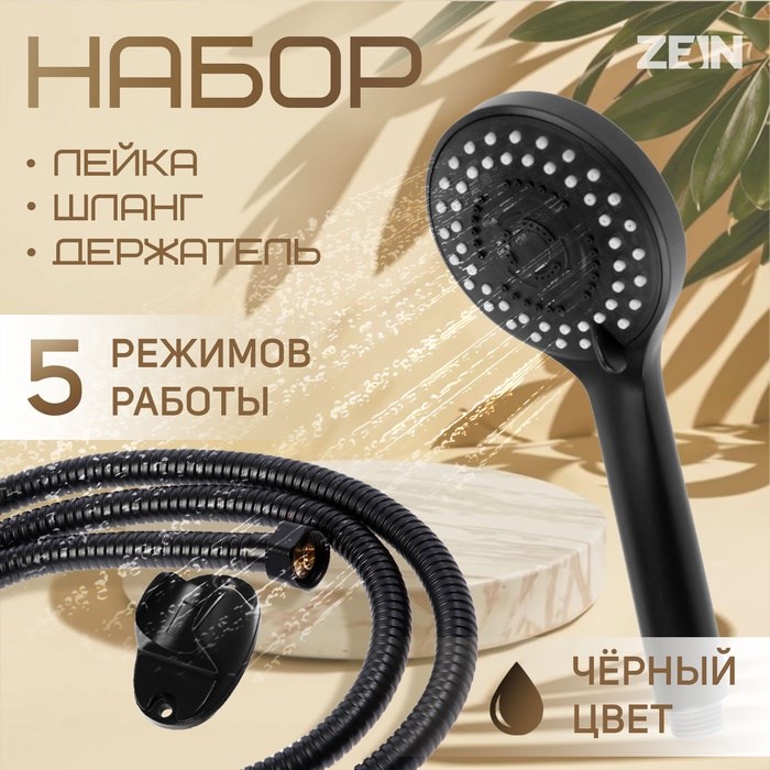 Набор для душа ZEIN Z0106, шланг 150 см, гайки металл, держатель, лейка 5 режимов, черный