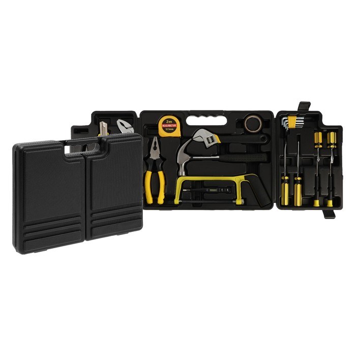 Составляющие набораДлинногубцы, Клещи, Молоток, Нож, Ножовка, Отвёртка, Плоскогубцы, Разводной ключ, Рулетка, Тестер, Шестигранные ключи