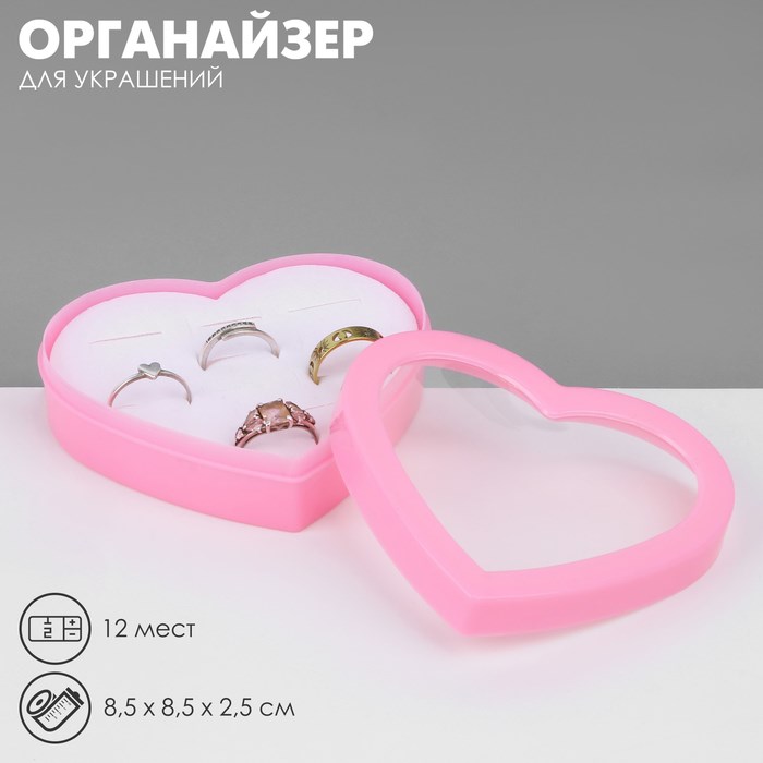 Органайзер для украшений «Шкатулка сердце» 12 мест, пластик, 8,5×8,5×2,5 см, цвет розовый