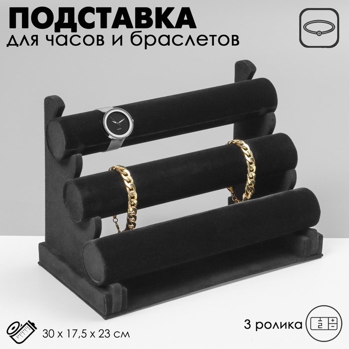 Подставка для часов, браслетов, флок, 3 ролика, 30×17×22,5 см, d=5 см, цвет чёрный