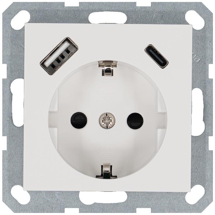 Розетка Shuko 16А с заземл. защ. шторки с 2-мя заряд. устройствами USB тип A+C 25Вт механизм бел. глянцевый Jasmart G5501USB-25W