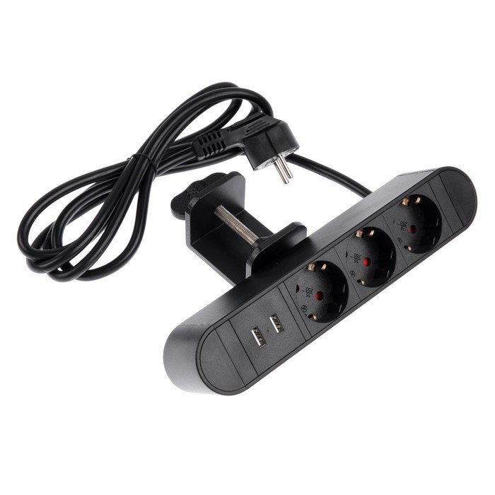 Розеточный блок на струбцине Luazon, 16А, трёхместный, 2xUSB, 2.1 A, провод 1,8 метра, черн.