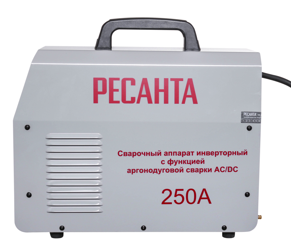Сварочный аппарат РЕСАНТА САИ-250АД AC/DC — современная инверторная аргонодуговая установка, позволяющая работать как на постоянном (сварка черных и нержавеющих сталей, меди, титана и пр.), так и на переменном токе (сплавы алюминия, магния, медные сплавы больших толщин и пр.), где требуется удаление окислов со свариваемой поверхности в режиме TIG, а также возможна сварка ММА покрытым электродом (рутиловым и основным покрытием).Режим ММА – режим ручной дуговой сварки покрытым электродом. Режим TIG – сварка неплавящимся (вольфрамовым) электродом в среде защитного газа (аргон).Основным принципом AC/DC установки является использование двойного инвертора и создание полуволн прямоугольной формы, которая делает сварочную дугу более стабильной, увеличивает тепловложение и очищающий эффект.Особенности модели: — Различные режимы сварки. — Режим работы 2Т/4Т. — Удобный цифровой LED-дисплей с индикацией сварочного тока. — Функция автоматического горячего старта Hot Start: более легкий и надежный старт дуги. — Функция высокочастотного бесконтактного поджига дуги. — Функция PreFlow: продувка горелки газом перед сваркой в режиме TIG. — Функция Down Slope: регулятор заварки кратера. Устанавливает время плавного снижения тока после завершения сварки в зоне конечного кратера. — Функция Post Gas: регулировка времени продувки газом после окончания сварки, чтобы избежать окисления разогретых электрода и детали. — Регулировка времени спада тока. — Сварочные аппараты оборудованы защитой от перенапряжения и перегрева.