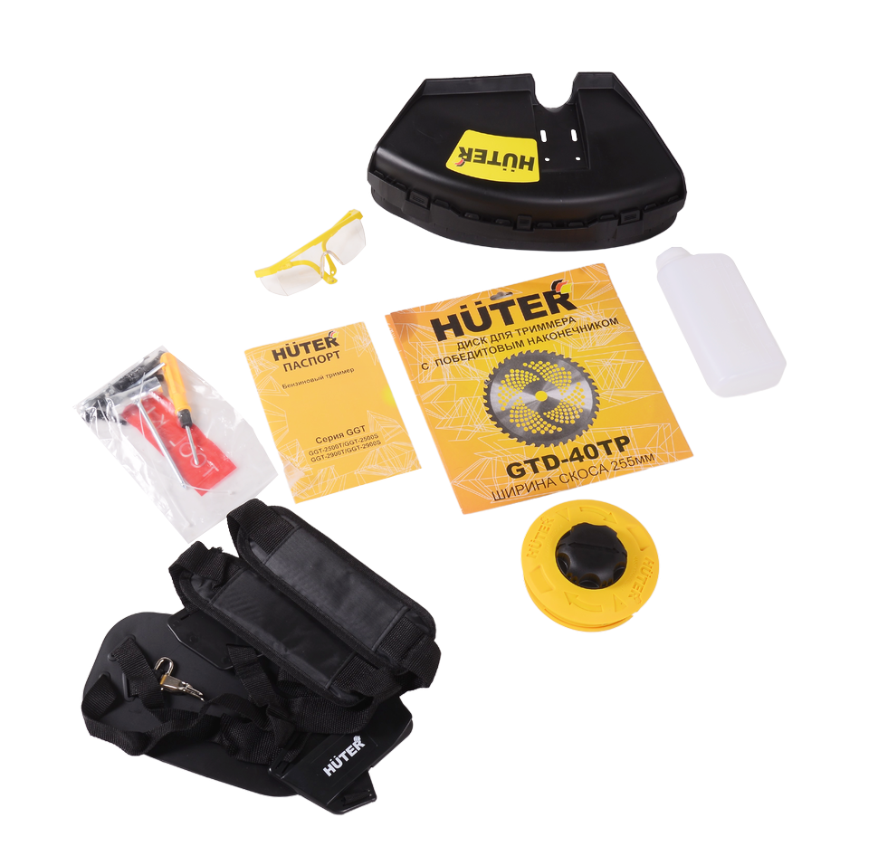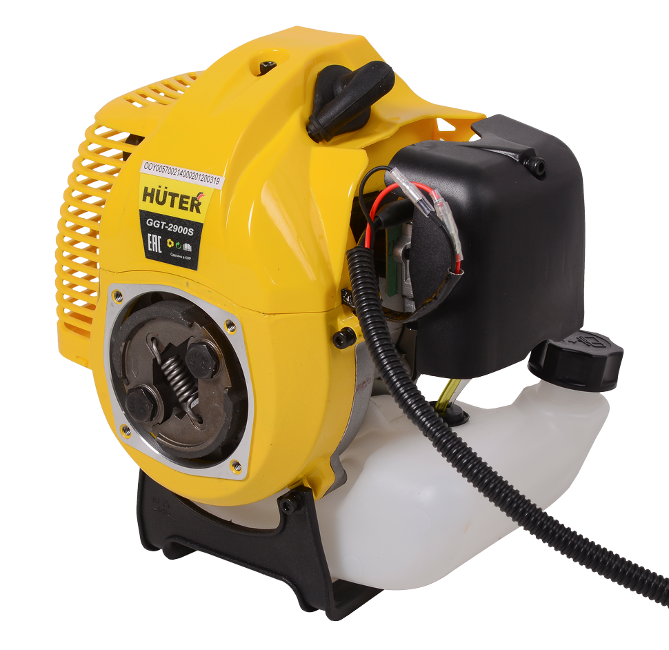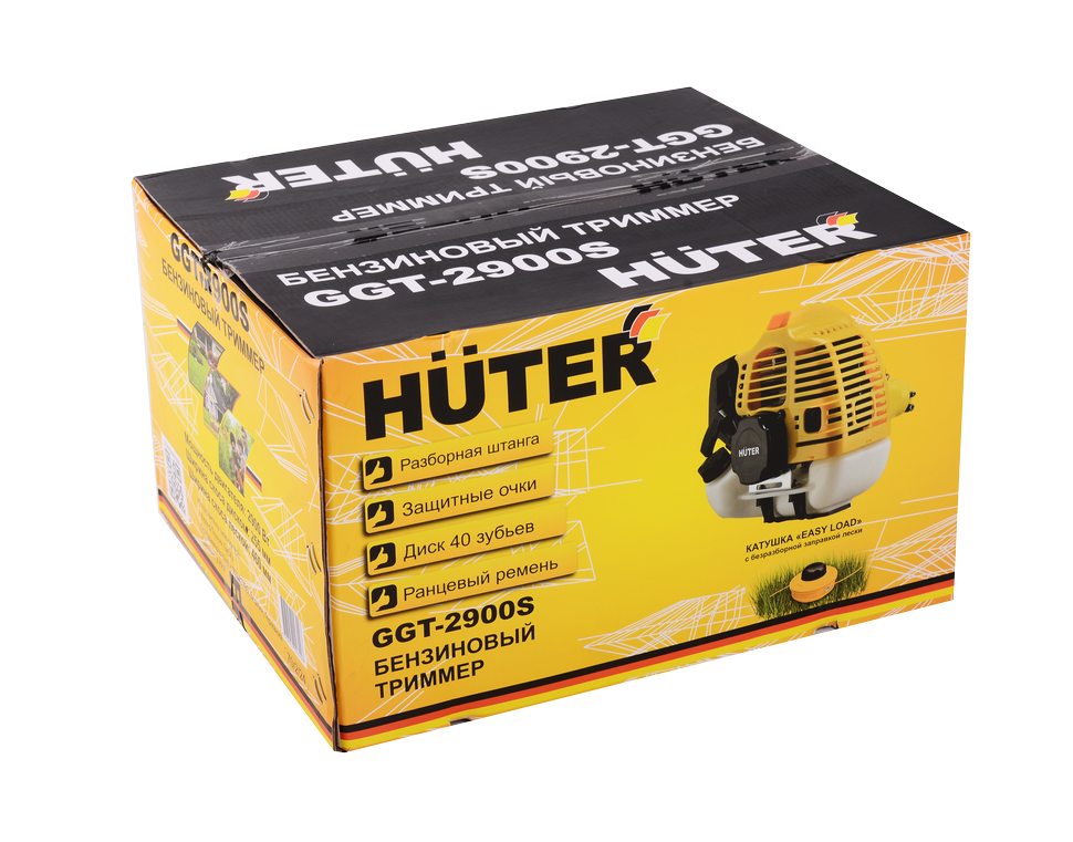 Триммер бензиновый HUTER GGT-2900S — новинка 2019 года. Новая модель представляет собой отличный инструмент для скашивания травы и современный вариант ручной косы. Косить траву, особенно если она высокая, триммером очень удобно. Как правило, владельцы участков отдают приоритет бензиновым моделям, ведь не на каждой даче есть электричество, а провода создают дополнительное неудобство.Новая модель триммера Huter отличается тем, что в комплектацию входят ранцевый ремень, диск 40 TP, а также защитные очки. Кроме того, у GGT-2900S штанга разборная в отличие от GGT-2900T, остальные параметры у обоих моделей одинаковые.Преимущества: — Бензиновый триммер Huter обладает полной автономностью, можно работать где угодно без связи с источниками энергии. — Топливный бак устройства полупрозрачен и позволяет визуально следить за уровнем его наполнения. — Удобная рукоятка позволяет регулировать параметры агрегата, прочно его удерживать, а так же направлять его рабочую часть в нужное место. — Надежный и оборотистый двухтактный двигатель с системой антивибрации и легким ручным запуском позволяет долго работать. — Управление триммером расположено прямо на рукоятке.Система безопасности: — Защитный кожух оберегает от отскоков камней и другого мелкого мусора в сторону пользователя. — Блокиратор курка газа позволяет избежать случайного нажатия курка и вращения режущего инструмента при заведенном двигателе. — Антивибрационная система триммера повышает комфорт при работе триммером.Обратите внимание! Топливную смесь следует приготавливать из бензина с октановым числом не менее 92 и специального масла. Необходимо использовать высококачественное масло, предназначенное для двухтактных двигателей с воздушным охлаждением. Запрещается использование масла, предназначенного для 2-х тактных двигателей с водяным охлаждением (для лодочных моторов)! Пропорция приготовления указывается производителем масла. Если пропорция не указана, то используется 1:40.