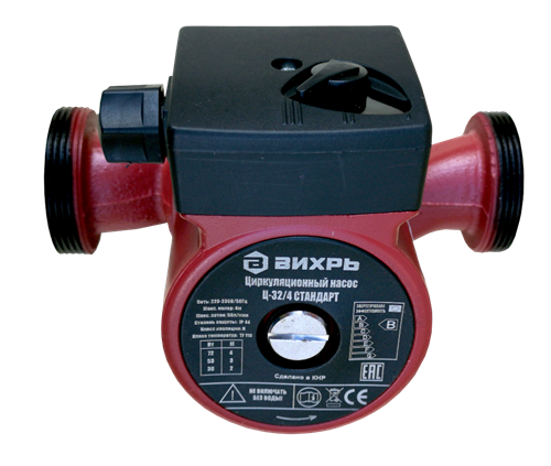 Ассортимент циркуляционных насосов пополнился новой бюджетной линейкой СТАНДАРТ с гарантийным сроком обслуживания 1 год, при этом качество насосов остается на высоком уровне.Циркуляционный насос ВИХРЬ Ц-32/4 предназначен для обеспечения циркуляции воды в системах отопления, круговых трубопроводах горячего и холодного водоснабжения, центральных отопительных установках и системах перекачки промышленных вод (системах кондиционирования, охлаждения). Насос представляет собой компактное устройство с всасывающей и нагнетающей функциями. Вода перекачивается при помощи вращения рабочего колеса электродвигателем насоса. Данный вид насосов надёжен, экономичен и прост в использовании. Крышка насоса изготовлена из чугуна, рабочее колесо из полимерных материалов, корпус электродвигателя из алюминия. Насос имеет три скорости работы, выбираемые ручным переключением вращающейся ручки на клеммной коробке. Охлаждение и смазка керамических подшипников осуществляется перекачиваемой жидкостью. Заглушка ротора позволяет удалять остатки воздуха из системы путём её откручивания и стравливания воздуха. В комплектацию не входит кабель подключения к сети. Следует использовать термостойкий трехжильный кабель с поперечным сечением каждой жилы не менее 0,75 мм2 и с резиновой изоляцией.В названии циркуляционных насосов Вихрь отражены два параметра, например: Ц-25/4. Первые две цифры — это диаметр присоединительных патрубков. В нашем случае 25 мм (1 дюйм) — диаметр резьбы гаек, поставляемых в комплекте с циркуляционным насосом. Он должен соответствовать диаметру труб (переходников) в системе отопления. В системах отопления наиболее распространены два диаметра — 25 и 32 мм. Второе число обозначает максимальный напор насоса. В нашем примере максимальный напор составляем 4 м, то есть он может создавать избыточное давление до 0,4 атм. Этот параметр должен превышать расчетный напор требуемый для системы отопления. Пример упрощенного расчета требуемого напора будет приведен ниже. Потребляемая мощность циркуляционных насосов регулируется ступенчато (3 положения). Мощность и максимальный напор для каждой ступени указан в таблице на корпусе насоса. Кабель питания подключается к клеммной колодке и в комплект не входит.Преимущества: — бесшумная работа, — установка непосредственно на трубопроводе, — малые габаритные размеры, — большой срок эксплуатации, — регулировка скорости перекачки жидкости.