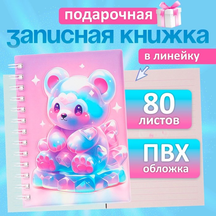 Записная книжка подарочная на гребне 80л,линия, цветной блок,обложка ПВХ 3D Мишка(17,6х13,5см) 105